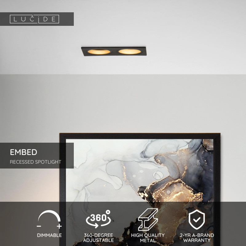 Moderní podhledové svítidlo Embed z kvalitního hliníku s matně černým lakem a bílým interiérem. Kompletně otočné a naklápěcí pro přesné nasměrování světla na důležité detaily. Možnost připojení ke stmívači. Rozměry: 17 x 8,3 x 10 cm. Spotřeba 2x50W, stmívatelné. Patice GU10.
