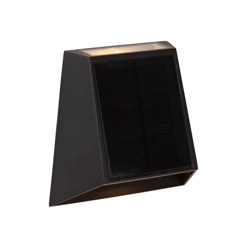 Nástěnné venkovní svítidlo Luton - solární LED svítidlo s geometrickým designem a automatickým senzorem. Rozměry 13 x 7,4 x 13,4 cm, teplé bílé světlo 2850K, krytí IP54. Inovativní osvětlení s netradičním směřováním světla.