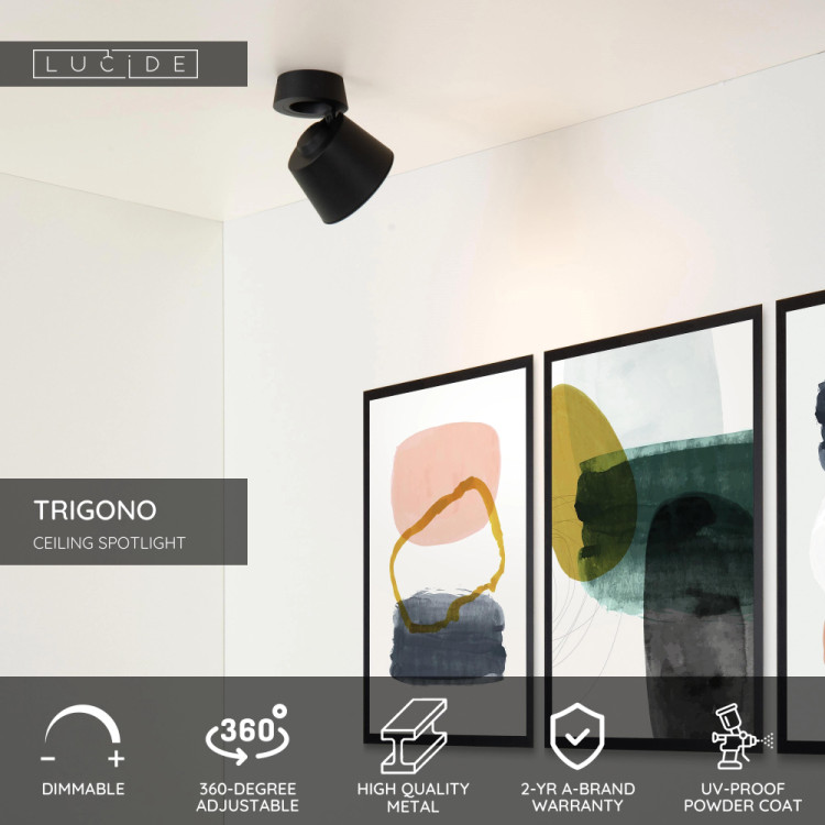 Stropní bodové svítidlo Trigono s kulatým designem a plným kovovým provedením. Otočné a naklápěcí – nasměrujete světlo přesně podle potřeby. Kompaktní rozměry 10,5 x 9,8 cm nezabírají mnoho místa. Možnost připojení ke stmívači pro perfektní osvětlení kdykoliv během dne. Spotřeba 1x50W, stmívatelné, žárovka není součástí balení. 2 roky záruka.