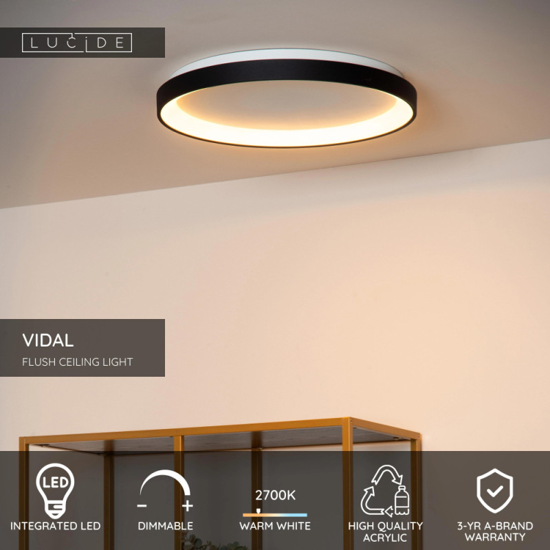 Kolem této stropní lampy prostě jen tak neprojdete. Přesto Vidal zůstává elegantní lampou s jemným světlem díky své mléčně bílé verzi a mosazným prstencem. Lampa skvěle funguje v hravém interiéru s teplými akcenty a dodá mu ten správný šmrnc. Její těleso má průměr 48 centimetrů a výšku 6 centimetrů. S jasem můžete bez námahy pohrávat pomocí externího stmívače – přizpůsobte si osvětlení přesně podle nálady. To z Vidal činí všestrannou stropní lampu, kterou můžete nainstalovat ve své kuchyni, jídelně nebo ložnici. Zapnutá nebo vypnutá, Vidal dodává místnosti extra šmrnc a styl.