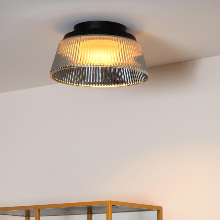 Kulaté stropní svítidlo Vixi s kouřovým žebrovaným sklem v retro stylu. Průměr 35 cm, integrovaný stmívatelný LED zdroj s teplým bílým světlem (2900K). Vhodné do předsíně, obývacího pokoje i kuchyně. Možnost připojení ke stmívači pro nastavení intenzity osvětlení. Vysoce kvalitní sklo. 5 let záruka.