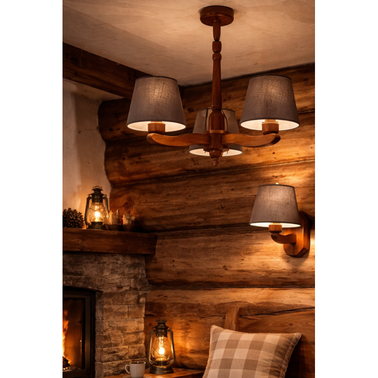Závěsné svítidlo REDO 9-832. Patice E27. Max. Příkon 3x60W. Typ zdroje klasická žárovka. Napájení 230V. Materiál dřevo. Barva látkový stínidlo.